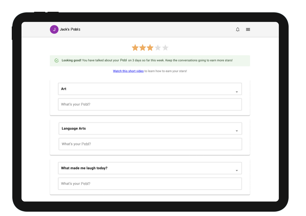 Kids write 3-5 word Pebl entries on any device such as a laptop, tablet, or phone, that summarize key events throughout their day to spark their memory at home to drive conversations.