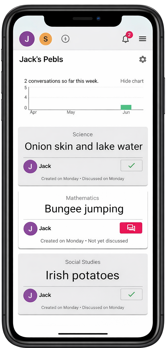 A Pebl is a gentle nudge, a prompt that hints at a moment in your child’s day. It serves as a reminder for them to share the complete story with you later on.
